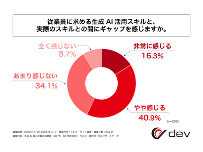 生成AIの導入が進む現代において、業務効率化・自動化の進展は従業員に新たなデジタルスキルの習得を求めています。しかし、この変化のスピードに、従業員のスキルが追いついているのか、あるいはスキルギャップが生じているのかは、昨今の企業経営における喫緊の課題となっています。そこで、株式会社devは、生成AIを業務に導入している企業の経営者を対象に「生成AI導入企業における従業員のスキルギャップに関する調査」を実施しました。