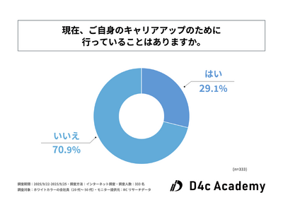 株式会社D4cアカデミー(本社:東京都中央区、代表取締役社長:和田 陽一郎)は、ホワイトカラーの会社員(20代~50代の男女)を対象に「AI時代における会社員のキャリアに対する不安に関する調査」を実施しました。この調査から、AI時代におけるホワイトカラーの会社員のキャリアに対する不安やキャリアアップに向けた活動の実態などが明らかになりました。