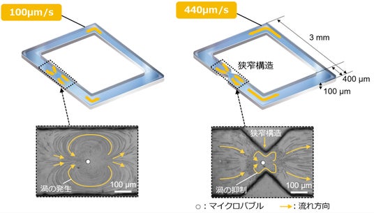・流路に狭窄構造を設けることで、バブル周辺に生成される渦を制限し、流速を440µm/sまで向上させることにも成功