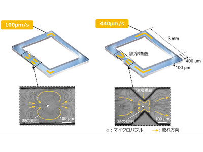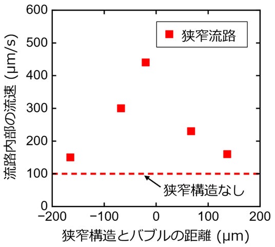 さらに、流路内部に断面積が局所的に小さくなる狭窄構造を設け、バブル周辺に生成される渦を制限することで、バブルによって生成された流れの大部分を流路の進行方向へ流すことが可能となり、流速を約440µm/sまで向上させることに成功しました。
