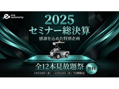 株式会社eve autonomy(イブ・オートノミー、静岡県磐田市、代表取締役CEO:星野 亮介、以下「eve autonomy」)は、2025年への感謝を込め、今年配信したセミナーを中心に、これまで公開してきたオンラインセミナーを2025年12月18日(木)~12月24日(水)の7日間限定で見放題とする特別企画を実施します。