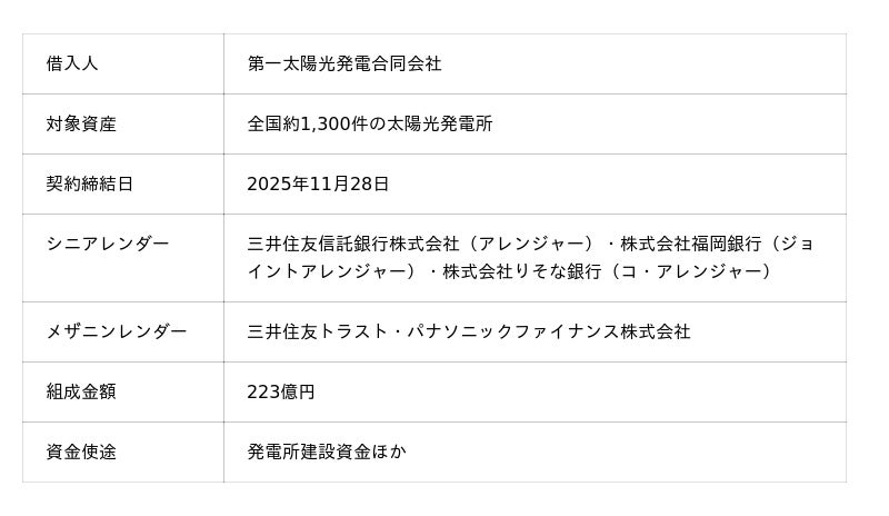 三井住友トラスト・パナソニックファイナンス株式会社(本社:東京都港区、取締役社長:浜野敬一、以下:「当社」)は、株式会社レノバ(本社:東京都中央区、代表取締役社長CEO:木南陽介、以下:「レノバ」)の連結子会社である第一太陽光発電合同会社を借入人とする小規模・分散型のNon-FIT※1太陽光発電事業向けのプロジェクトファイナンス(以下:「本件」)において、メザニン※2レンダ―として参画しました。