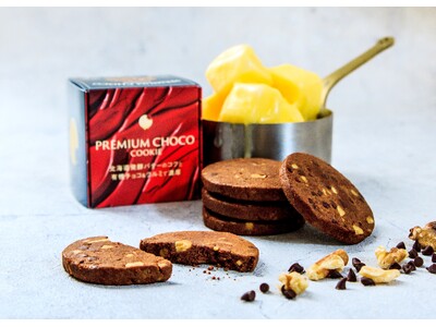 チョコとくるみのクッキーは、北海道産発酵バター100%使用した贅沢クッキー、クルミとドミニカ産カカオのチョコチップがたっぷりコクのあるクッキー。1枚、2枚と止まらなくなる食感と味わい。有機カカオ使用した豊かな風味のココアパウダーをたっぷり。バニラ、アーモンドを配合したリッチな生地にビターキャラメルのほろ苦い深みがアクセント。