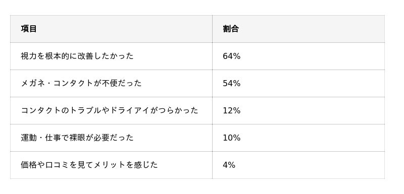 「視力を根本的に改善したかった」64%が最多で、次いで「メガネ・コンタクトが不便だった」54%が多かった。