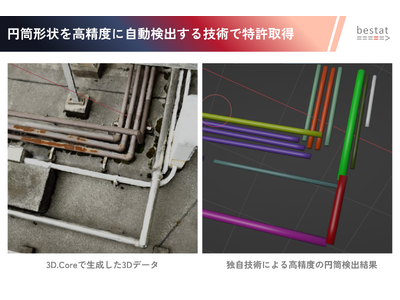 産業用3Dデータ特化のbestat株式会社(本社:東京都文京区、代表取締役:松田 尚子、以下bestat)は、点群・メッシュデータから円筒形状を高精度に自動検出する新技術について、日本国内で特許を取得しました。本技術により、欠損や遮蔽により完全な360度計測ができない環境でも必要な円筒のみを正しく抽出し、3DのCADデータ(ソリッドデータ)として活用できるようになります。