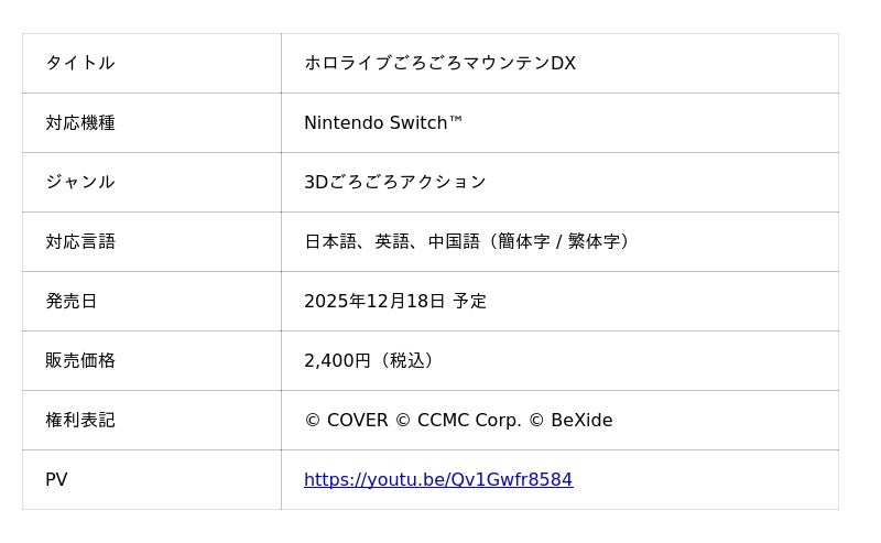 株式会社ビサイド(本社:東京都立川市、代表取締役社長:南治 一徳、以下ビサイド)は、サブブランド「B-SiDE」として開発し、ホロライブプロダクションが提供する二次創作ゲームブランド「holo Indie」にてリリースされるNintendo Switch(TM)︎タイトル『ホロライブごろごろマウンテンDX』の予約受付(あらかじめダウンロード)をニンテンドーeショップにて開始いたしました。