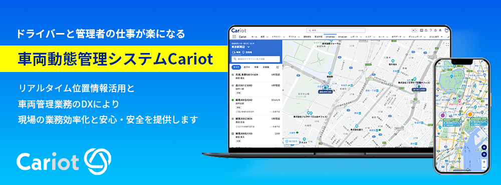 車両動態管理システム「Cariot」は、車載デバイスをクルマに取り付ける、またはモバイルアプリを起動するだけで、クルマのデータを簡単に、リアルタイムに取得・可視化・活用できるシステムです。