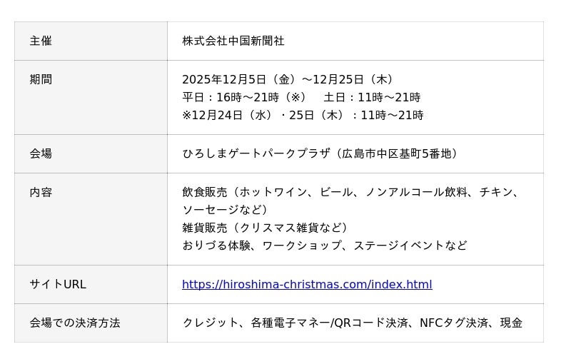「ひろしまクリスマスマーケット2025」は、「株式会社中国新聞社」が主催するイベントであり、2023年の初開催以降、広島の新たな冬の風物詩として親しまれています。