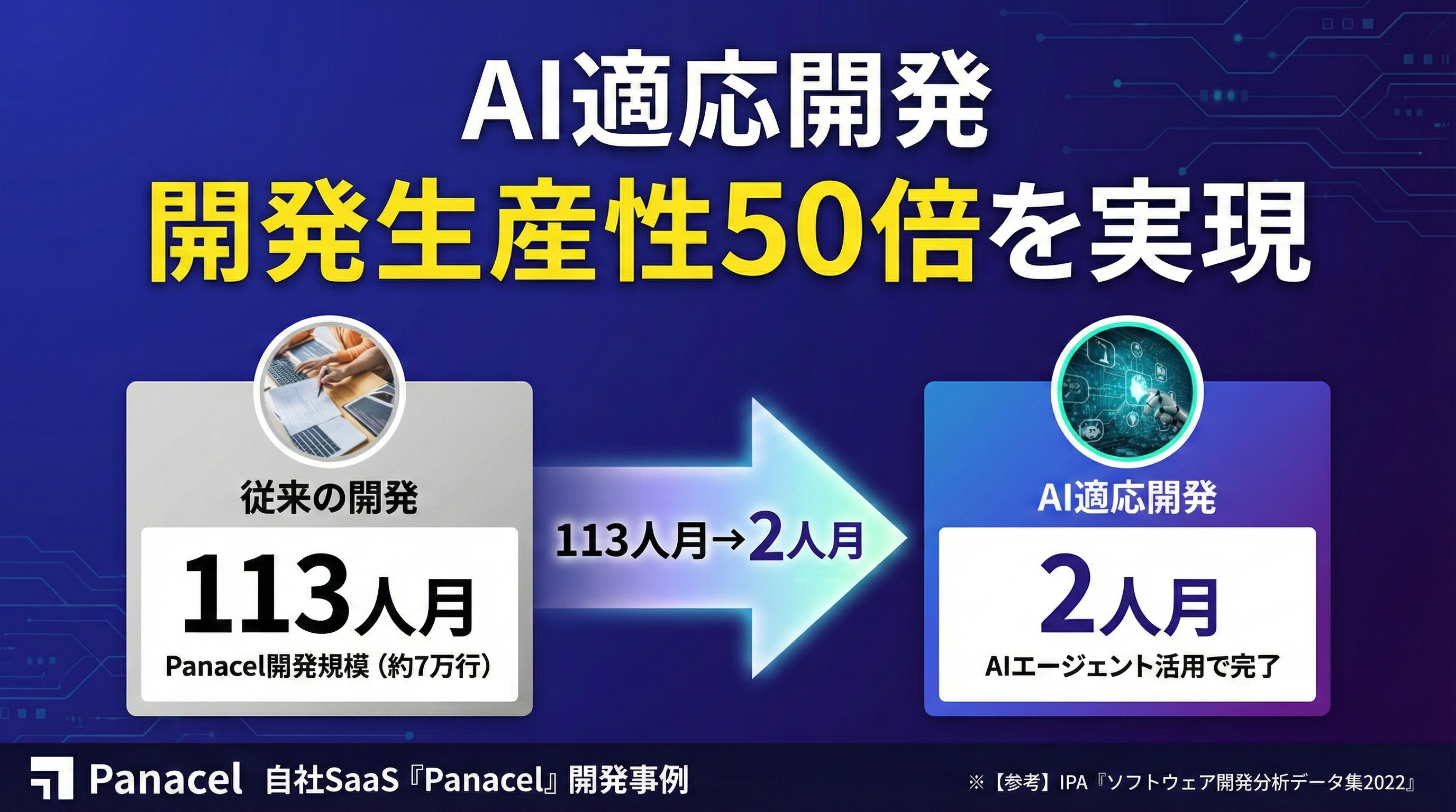 Panacel」の開発において、従来手法では113人月規模と想定される内容を
