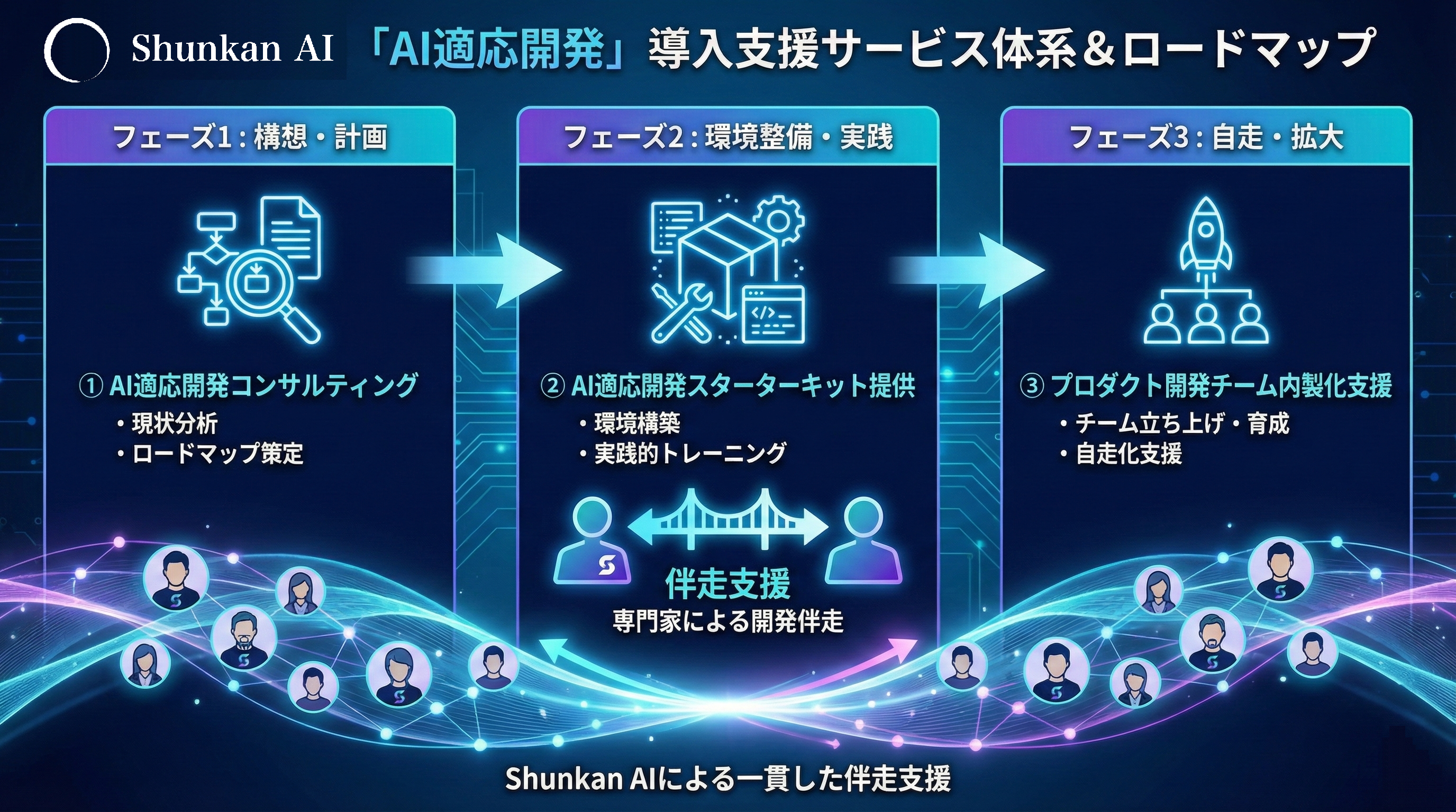 AI適応開発は、単なるツール導入ではなく、プロセス・体制・アーキテクチャの再設計を伴う取り組みです。Shunkan AIでは、以下の有償サービスを通じて、企業様のAI適応開発導入を伴走支援いたします。