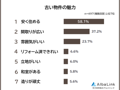 株式会社AlbaLink(本社:東京都江東区、代表取締役:河田 憲二)は、築20年以上の物件に住んでいる497人を対象に「古い物件の魅力に関する意識調査」を実施し、そのデータをランキングにしました。