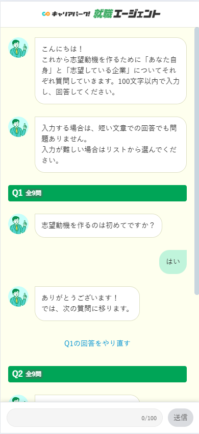 ユーザーの経験を多角的に引き出すため、キャリアアドバイザーが厳選した9つの質問を用意。質問に答えていくだけで、企業の特徴と自分のビジョンや本音をマッチさせた魅力的な志望動機の土台を作成します。