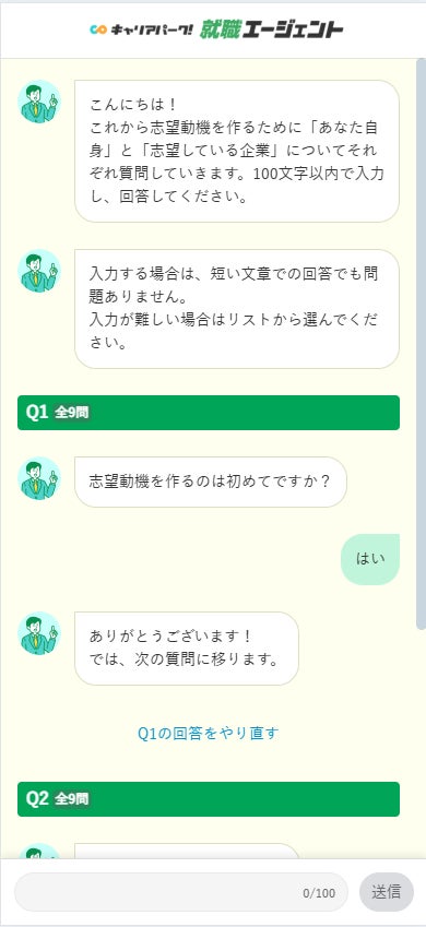 のもと、チャット形式で9つの質問に答えるだけで、AIが志望企業の特徴と利用者の強みの合致するポイントを言語化し、魅力的な志望動機文を自動で3つ作成します。