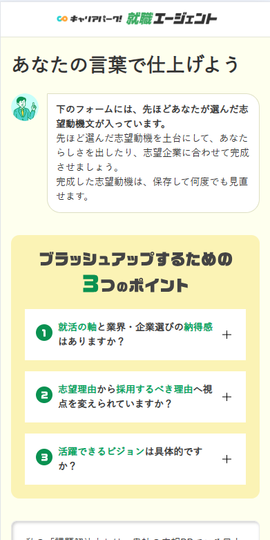 AIが作った志望動機を、キャリアアドバイザーのノウハウを参考にしながら編集できるページです。AIが作ったたたき台を最後に自分の言葉で仕上げることで、効率的に自分らしい志望動機を作成することができます。