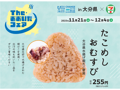 一般社団法人うみらいふは、若者の魚離れや地域課題、海洋ごみ問題の解決に向けた取り組みの一環として、(株)セブン‐イレブン・ジャパンとタイアップし、2025年11月21日(金)より期間限定で大分県内のセブン‐イレブン全店舗で「たこめしおむすび」の販売を開始いたしました。具材には大分県北部で水揚げされた姫だこを使用、さらにご飯も姫だこの煮汁や出汁を加え炊き上げることで、外も内も姫だこを楽しめる逸品となっています。おむすびを実際に手にとりご購入いただいたお客様からは大変ご好評のお言葉を頂いており、少しではありますが若者の魚離れ解消や海洋ごみ問題の啓発にも繋がったと思います。