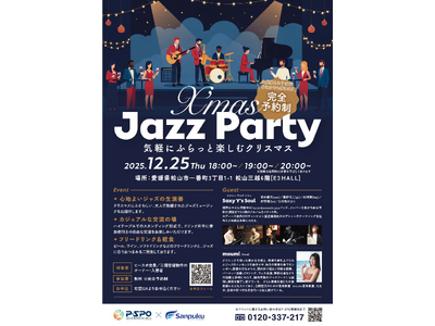 P・SPOは、松山三越6階E3 HALLで12月25日にクリスマスジャズイベント「Xmas Jazz Party」を開催します。実力派アーティストによる生演奏を、立食形式でお楽しみいただけます。
