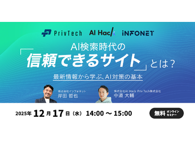 Priv Tech株式会社(本社:東京都港区、代表取締役:中道 大輔、以下Priv Tech)は、株式会社AI Hack(本社:東京都港区、代表取締役:中道大輔、以下AI Hack)および株式会社インフォネット(本社:東京都港区、代表取締役社長 古宿智、以下インフォネット)と共同で、無料オンラインセミナー『AI検索時代の「信頼できるサイト」とは?最新情報から学ぶ、AI対策の基本』を開催いたします。