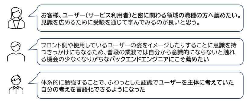 ”資格支援手当”の対象資格として定めました。デザイナーのみならず、エンジニアや管理職、バックオフィスの社員も受験し、合格者が103名/会社全体の3割が資格を保持する結果となりました。(内訳:エンジニア60名、デザイナー22名、コンサルティング10名、BO/営業等6名、管理職5名)