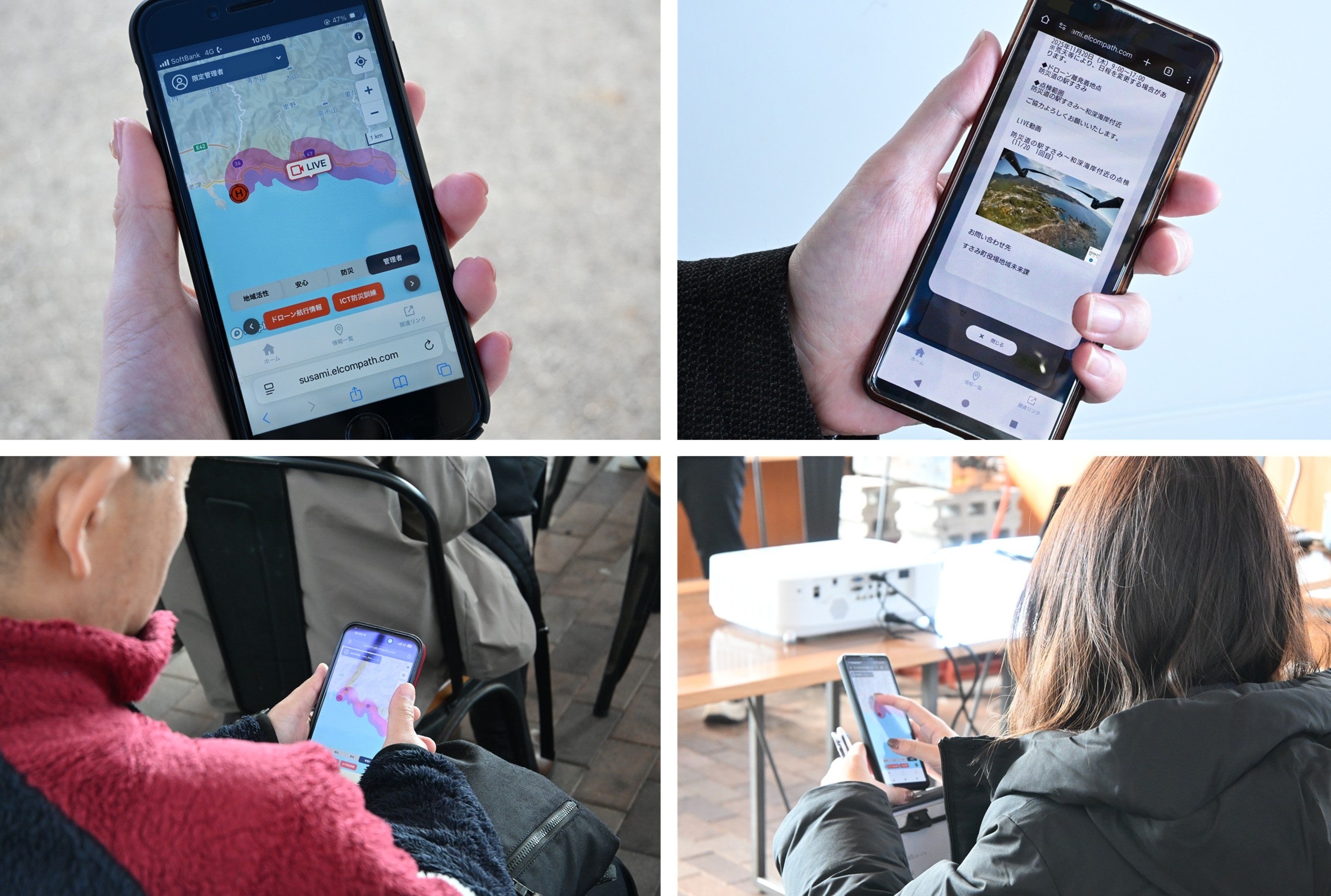 左上・右上画像:自動航行ドローンから撮影された映像をリアルタイムで配信する「すさみしるべ」左下・右下画像:「すさみしるべ」で沿岸部の状況を確認する様子
