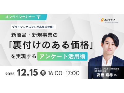 ダイレクトリサーチプラットフォーム「ユニーリサーチ」を運営する株式会社プロダクトフォース(本社:東京都港区、代表取締役CEO 浜岡 宏樹、以下「プロダクトフォース」)と、プライシングの専門コンサルティングを手がけるプライシングスタジオ株式会社(本社:東京都港区、代表取締役CEO 高橋 嘉尋、以下「プライシングスタジオ」)は、両社共催にてオンラインセミナー「新商品・新規事業の“裏付けのある価格”を実現するアンケート活用術」を2025年12月15日(月)16:00~17:00に開催いたします。