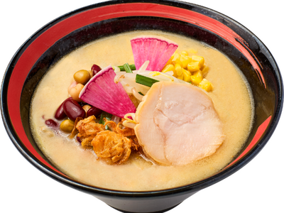 味噌味の「彩」は、味噌の深いうま味と彩り豊かさを表現したバランスの一杯。ハラール認証味噌を使用し、甘口でまろやかな味わいに仕上げました。トッピングは、鶏胸チャーシュー・紅芯大根・ミックスビーンズ・コーン・フライドオニオン・もやし・ニラの7種類の具材が生む彩りと食感が楽しめます。