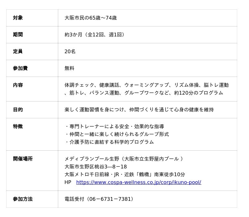 「コ・ス・パ」のブランド名で、フィットネスクラブ・テニスクラブ・キッズスイミングスクールの運営するほか、24時間営業フィットネスジム「FITBASE24」「キュッパ」、公共スポーツ施設の受託運営など、関西圏を中心に計64店舗を展開する株式会社COSPAウエルネス(本社:大阪市中央区、代表取締役:大友 康彰 )は、大阪市が推進する介護予防施策「貯筋トレーニング」事業を受託し、2025年11月より市内でプログラムを開始しました。本事業は、前期高齢者(65歳~74歳)を対象に、筋力やバランス力を高める運動習慣を身につけることで、転倒予防と健康寿命の延伸を目指します。