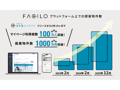 株式会社Facilo(本社:東京都中央区、代表取締役 CEO:市川 紘、以下「ファシロ」)は、2023年2月から提供する不動産コミュニケーションクラウド『Facilo物件購入クラウド』(以下、物件購入クラウド)において、顧客ごとに発行する専用マイページの利用者数が100万人、『物件購入クラウド』経由での提案物件数が累計1,000万件を超えたことをお知らせします。