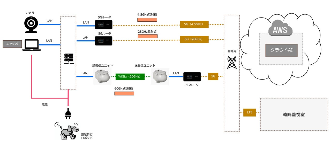 ・既存の公衆5G(4.5GHz帯、28GHz帯)に対して、AI電波方向制御を見据えたメタサーフェス反射板(可搬型の静的反射板)を使用することによる適応的な通信環境の構築と、移動巡視ロボットとの高速無線通信を確保することによる、エッジ・クラウド連携映像AIとの組み合わせ効果の検証。さらに、実験局(無線局免許を取得)により構築する公衆5G(28GHz帯)に対して、動的反射板を使用した場合の同様の検証。