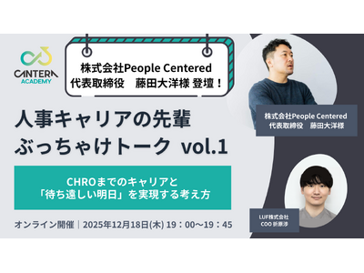 LUF株式会社(本社:東京都港区、代表取締役:堀尾 司)は、は、株式会社People Centered 代表取締役の藤田 大洋 氏をゲストにお招きし、オンライントークイベント「人事キャリアの先輩 ぶっちゃけトーク vol1 ~CHROまでのキャリアと「待ち遠しい明日」を実現する考え方~」を2025年12月18日(木)に開催いたします。