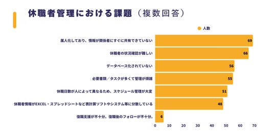 「属人化しており、情報が関係者にすぐに共有できない」が最も多く挙げられる。これは次点の「休職者の情報把握が難しい」にも繋がるといえる。