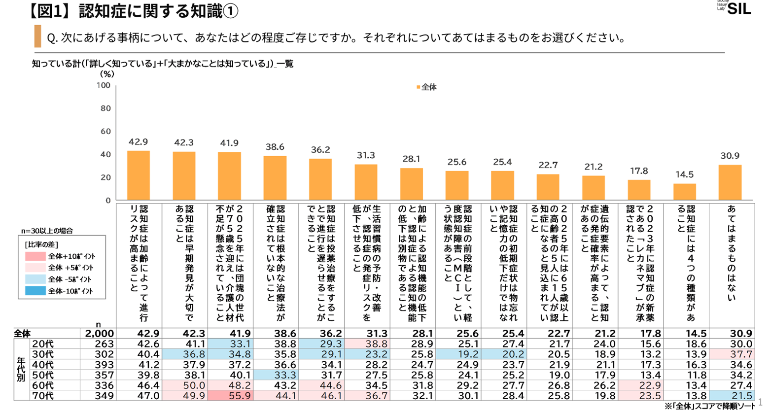 また、「認知症の初期症状は物忘れや認知機能の低下だけではない」の項目を知っていると回答した人は、全世代では2割強に留まり、比較的スコアの高い60代(27.7%)、70代(28.4%)でも3割をわずかに下回る程度で、加齢との違いが認識されていない実態も明らかになりました【図1】。