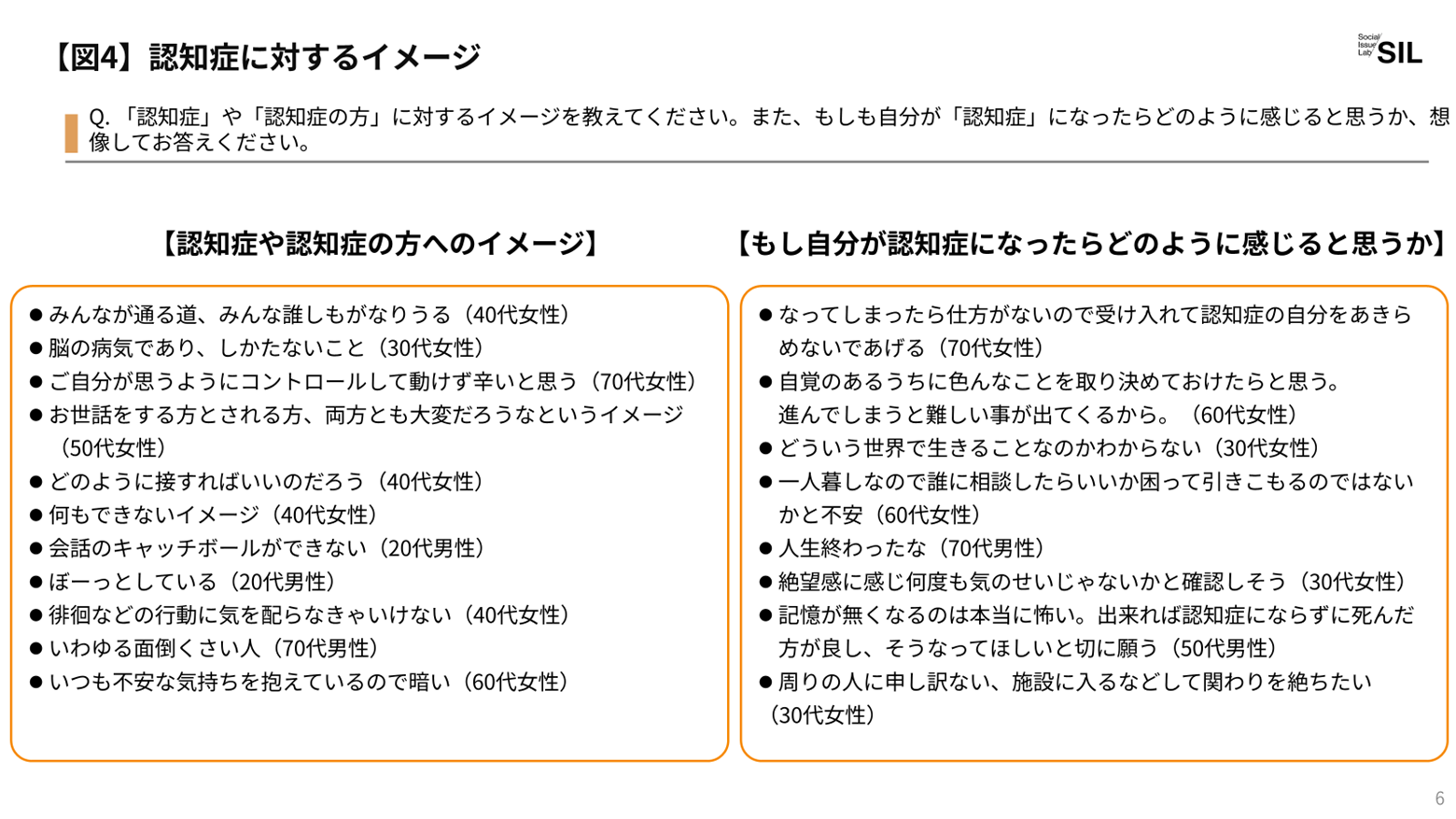 ・認知症や認知症の方に対するイメージを、また、もしも自分が認知症になったらどのように感じると思うかを自由回答でも尋ねました。結果からは、「誰しもがなりうる」といった受け止める声も一部みられましたが、一方で「イメージがつかず接し方が分からない」「何もできない」など、どうしていいか分からない困惑や諦めに近い心情も多く確認できました。