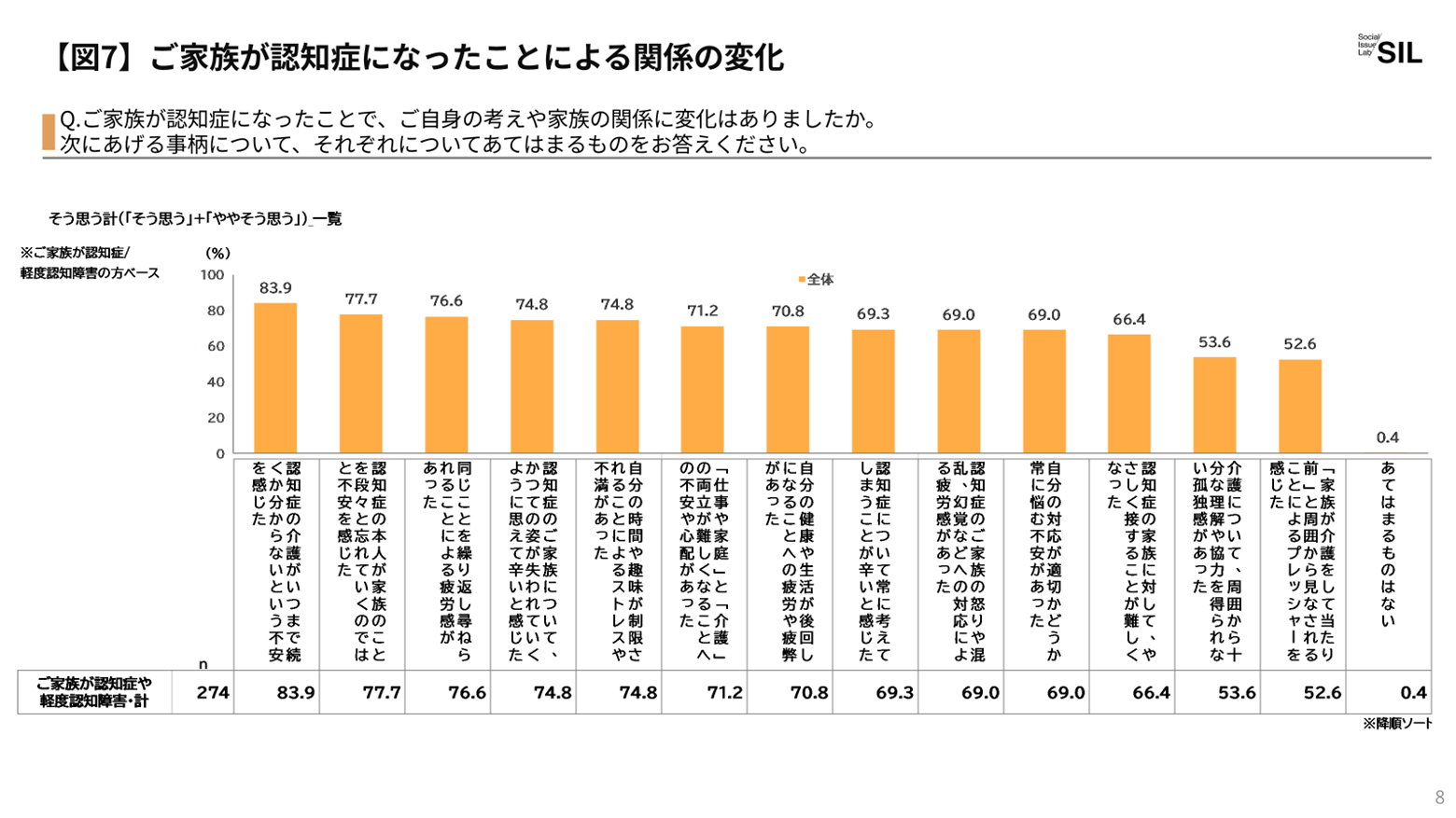 自身の考えや家族関係の変化トップは「介護がいつまで続くか分からない」不安(8割強)