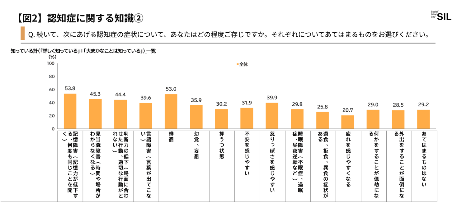 ・認知症の症状として半数以上が知っていると回答したものは、「記憶障害(53.8%)」「徘徊(53.0%)」があります。一方で、認知症になるご本人が自覚する初期症状といわれている「疲れを感じやすくなる(20.7%)」「何かをすることが億劫になる(29.0%)」「外出をすることが面倒になる(28.5%)」はいずれも2~3割とそのほかの症状に比べて認知が進んでいない様子がうかがえます【図2】。