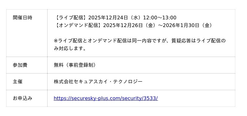 安全なWebサイトを実現するために脆弱性診断とクラウド型WAFを提供する株式会社セキュアスカイ・テクノロジー(本社:東京都千代田区、代表取締役:大木 元 以下、セキュアスカイ)はASM(Attack Surface Management/アタックサーフェスマネジメント)をテーマとした無料ウェビナー「いま注目のASMと脆弱性診断の違いをわかりやすく解説」を2025年12月24日(水)より、ライブ配信およびオンデマンド配信にて開催いたします。