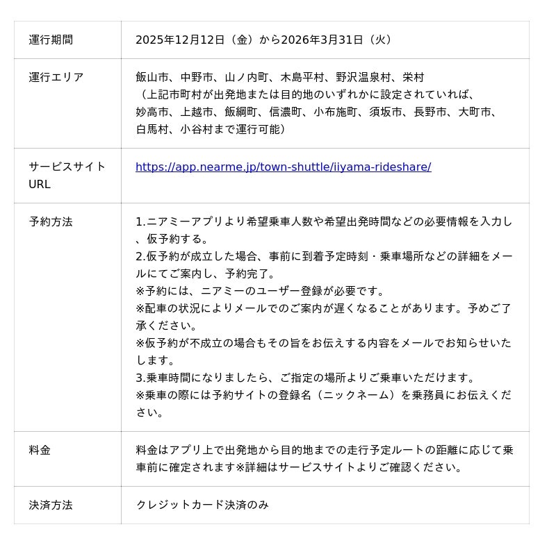 移動の課題に取り組むソーシャルデザインカンパニーの株式会社NearMe(本社:東京都中央区、代表取締役社長:高原幸一郎、以下:ニアミー)は、長野県飯山市及び長野交通株式会社(本社:長野県飯山市、代表者:高橋眞紀子)と連携し、2025年12月12日(金)より『いいやまライドシェア』の実証実験を開始いたします。