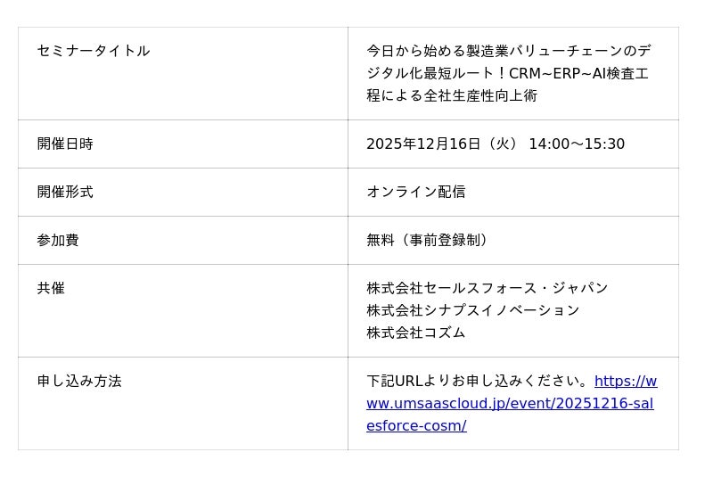 AI・IoTの力で製造業のDXを推進するスタートアップ、株式会社コズム(本社:東京都千代田区、代表取締役:橋本優希、以下 コズム)は、株式会社セールスフォース・ジャパン、株式会社シナプスイノベーションと共催で、2025年12月16日(火)14:00~15:30に、無料オンラインセミナー「今日から始める製造業バリューチェーンのデジタル化最短ルート!CRM~ERP~AI検査工程による全社生産性向上」を開催いたします。