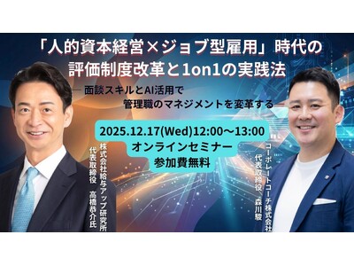 ビジネスコーチ株式会社(本社:東京都港区、代表取締役社長:細川 馨、東証グロース:9562)の子会社であるコーポレートコーチ株式会社(本社:東京都港区、代表取締役社長:森川 駿、以下当社)は、12月17日(水)に、株式会社給与アップ研究所 代表取締役 高橋恭介氏をお招きし特別セミナーを開催いたします。「人的資本経営×ジョブ型雇用」時代の評価制度改革と1on1(ワンオンワン)の実践法について、余すことなくお話しいただきます。