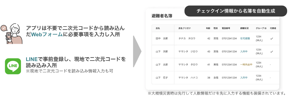 避難所到着時には、アプリ不要で二次元コードから読み込んだWebフォームに必要事項を入力する方法をメインに、バカンのLINE公式アカウント「VACAN防災」を用いてLINEでのQR読取し、情報入力を行う2つの方法でデジタルチェックインを実施。