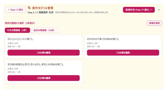 ●「英作文ドリル」機能では、問いたい文法事項などを選ぶだけでAIが問題を生成。短い時間で各学校の授業やカリキュラムに合ったテーマで生徒に対してライティング学習を促せる