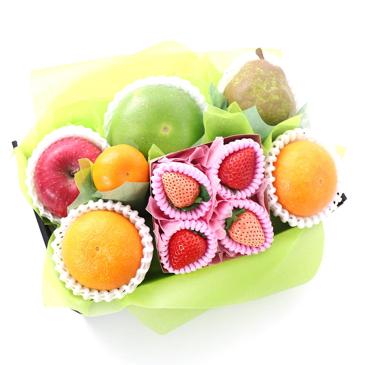♦内容:紅まどんな2玉、紅白いちご(赤2/白2)、みかん、りんご、ラフランス、メロゴールド
