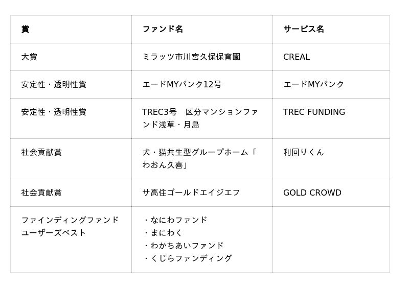 一般社団法人不動産クラウドファンディング協会(代表理事:横田 大造、以下「当協会」)は、不動産クラウドファンディングにおける、優れたファンド・サービスを表彰する「