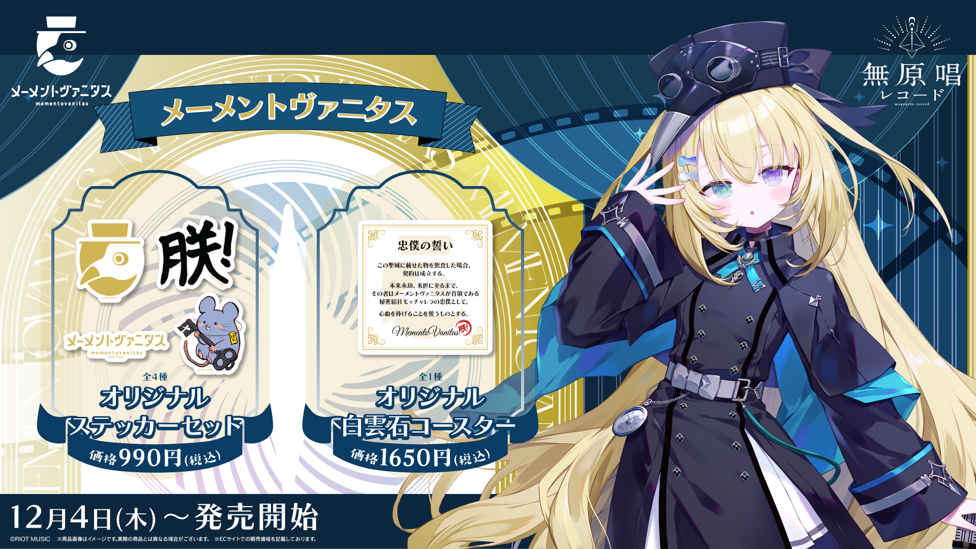 2025年12月4日(木)よりバースデー記念グッズの販売を開始いたしました。 一人称である“朕”の文字やファンを具現化したキャラクターなど、メーメントヴァニタスのモチーフを集めた「オリジナルステッカーセット(全4種)」と忠僕(ファン)の誓いを刻んだ「オリジナル白雲石コースター」をご用意しています。