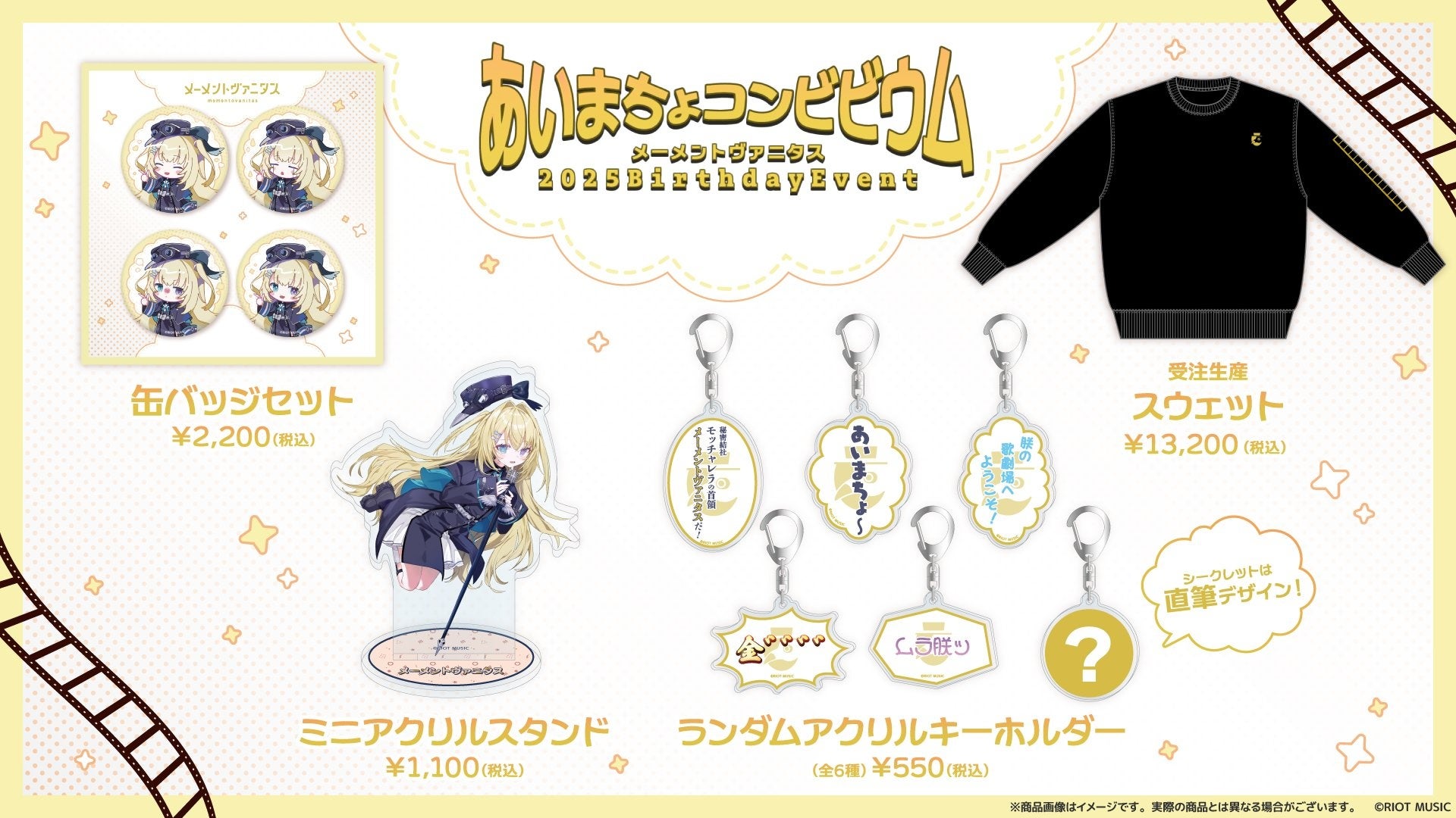 株式会社RIOT MUSIC(本社:東京都港区、代表取締役:舩橋 純、読み:ライオットミュージック、以下「RIOT MUSIC」)が運営するVSingerレーベル「無原唱レコード」は、メーメントヴァニタス 2025BirthdayEvent『あいまちょコンビビウム』を2025年12月6日(土)に開催することをお知らせいたします。これに伴い、配信チケットやイベントグッズ、バースデー記念グッズの販売を開始いたしました。