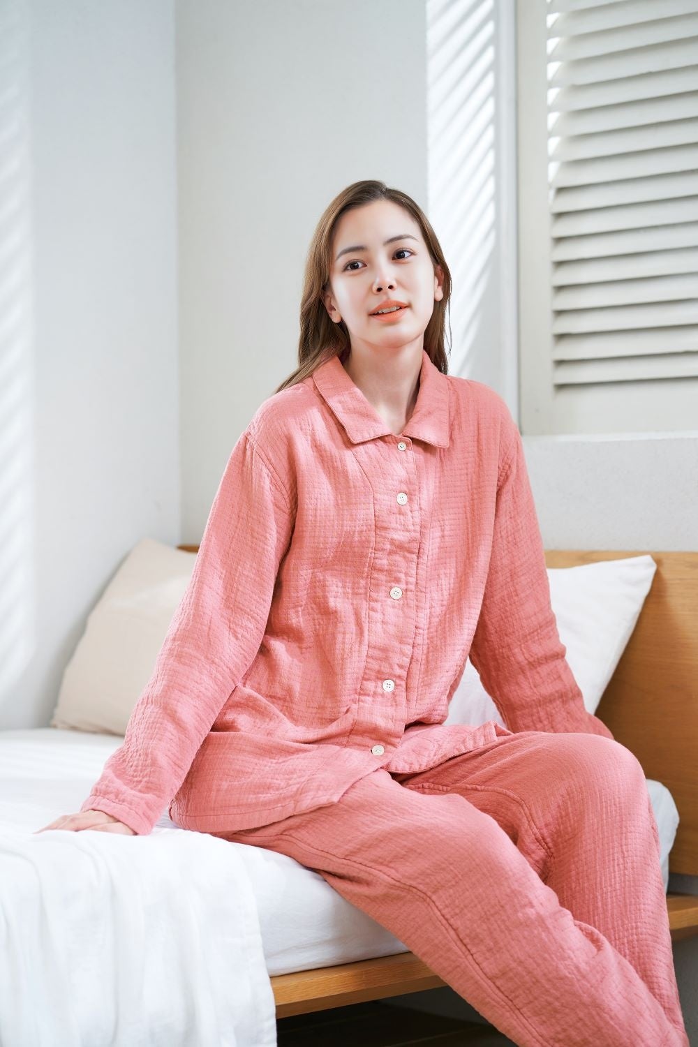マシュマロワッフルガーゼライトは、寒い季節を温かく、快適な眠りの為のパジャマです。シャツ襟と開襟の2通りの着方が出来るデザインです。