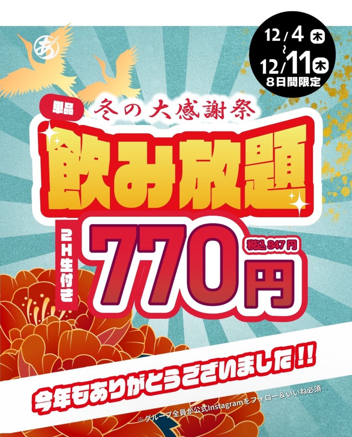 期間中は、生ビール付き2時間飲み放題を770円(税込847円)にてご利用いただけます。