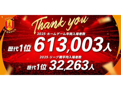 2025シーズンにおいて、名古屋グランパスのホームゲーム(明治安田J1リーグ19試合)年間入場者数が「613,003人」となり、クラブ史上初となる60万人突破となりました。また、リーグ戦の一試合あたりの平均入場者数は「32,263人」となり、こちらもクラブ史上初となる平均入場者数3万人を超えました。