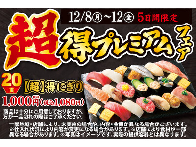KOZOホールディングス株式会社の子会社である株式会社小僧寿しは、持ち帰りすし店「小僧寿し」にて、12月8日(月)~12月12日(金)の期間限定で『【超】得プレミアムフェア』を開催します。※店舗により未実施の場合がございます。
