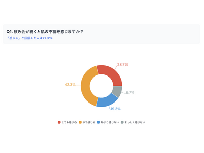 その結果、「とても感じる」(28.7%)と「やや感じる」(42.3%)を合わせると、71.0%の方が飲み会続きで肌の不調を実感していることが明らかになりました。