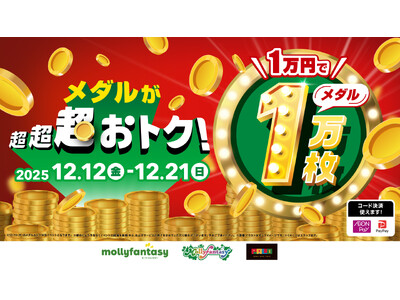 株式会社イオンファンタジー(本社:千葉県千葉市、代表取締役社長:藤原徳也、以下、当社)は、12月12日(金)より「モーリーファンタジー」「PALO」をはじめとする当社のアミューズメント施設においてメダルゲームコーナーをご利用のお客さま向けに、メダルイベント「1万円でメダル1万枚」を開催いたします。このイベントはメダルゲーム用メダルを通常の貸出枚数よりも、大変お得な枚数で貸し出しするイベントです。